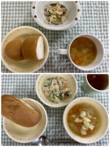 給食 お茶・ロールパン・マカロニ入り野菜スープ・ツナサラダ