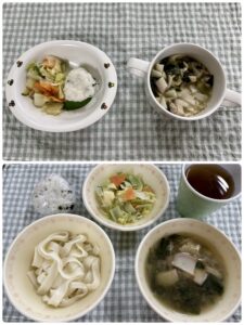 給食 お茶・きしめん・わかめおにぎり・野菜のマヨポンあえ